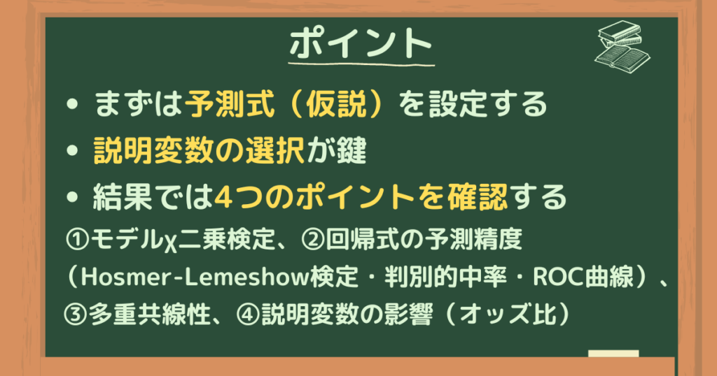 次のポイントが、先行研究や臨床経験から必要な説明変数を選ぶことです。このポイントが特に重要です。変数選択法だけで説明変数を決定してしまうと、臨床的に意味のある変数が抜けてしまうことがあります。そのためあなたの臨床経験をもとに、目的変数に影響を与えると思われる変数を強制投入するようにしましょう。