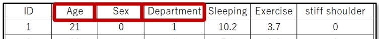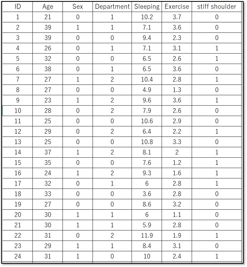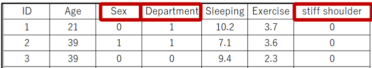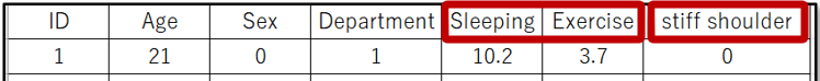 今回は、Sleeping(睡眠時間)とExercise(運動時間)がStiff shouler(肩こりの有無)に影響を与えるかを考えてみます。つまり説明変数が「Sleeping(睡眠時間)とExercise(運動時間)」、目的変数が「Stiff shouler(肩こりの有無)」です