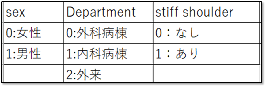 ちなみに、質的変数はダミー変数に変換して投入しています。今回のデータではSex(性別)とDepartment(部署)、Stiff shoulder(肩こりの有無)が質的変数なので、これらの変数を図のようにダミー変数に変換しています。