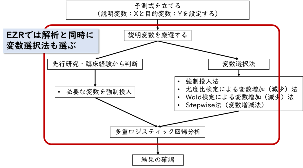 説明変数の選択方法は、変数選択法と呼ばれる方法で、統計的に変数を選択するとともに、先行研究・臨床経験から判断して必要な変数を強制投入します。下記で詳しく解説します。