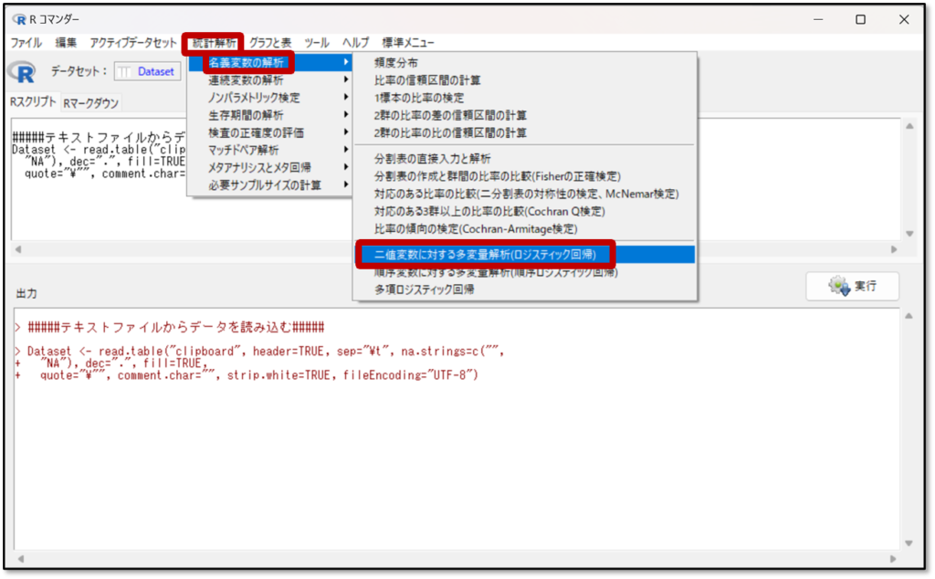 それでは多重ロジスティック回帰分析を実施していきましょう。EZRの操作画面で、「統計解析」→「名義変数の解析」→「二値変数に対する多変量解析(ロジスティック回帰)」を選択します。