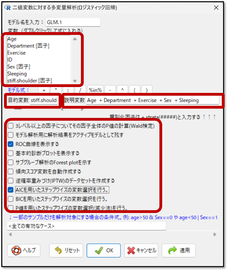 このときに変数選択法も選びます。重回帰分析の時と同様に、とくべつな理由がなければ、AICを用いたステップワイズの変数選択にチェックを入れましょう。