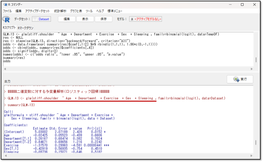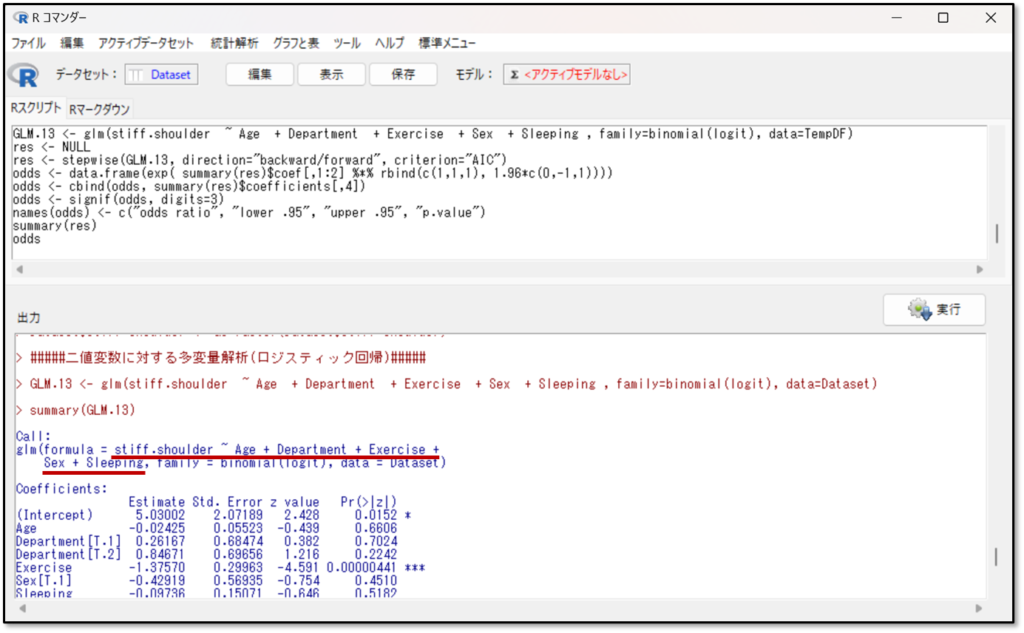 上記の出力画面の赤線の部分が、ステップワイズ法にて説明変数を選択するの、自身で設定した予測式です。目的変数~波線、説明変数+説明変数+・・・と表示されます。今回の場合だと目的変数の肩こりの有無=年齢+部署+運動時間+性別+睡眠時間の予測式を立てて、解析を行ったことが分かります。