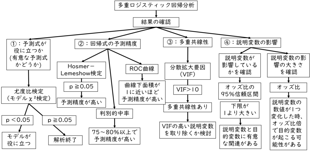 多重ロジスティック回帰分析の結果は下記について確認します。