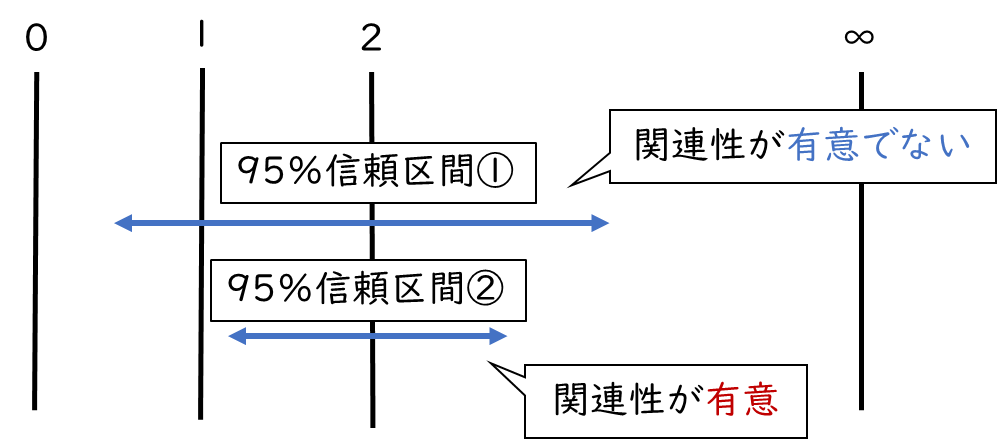 例えば下記の図で見ると、➀であれば有意な関連がないと判断し、②であれば有意な関連があると判断します。