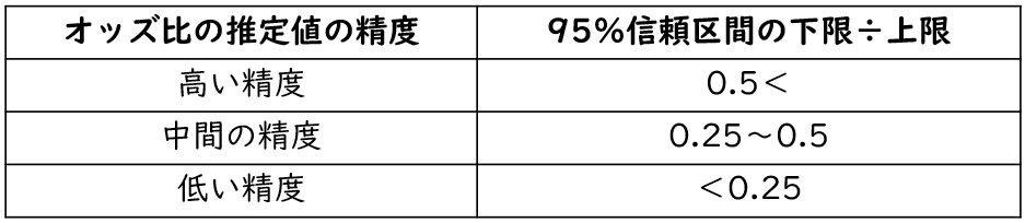 オッズ比の精度を確認する計算は簡単で、オッズ比の「95%信頼区間の下限値÷上限値」です。基準は下記の表の通りです。