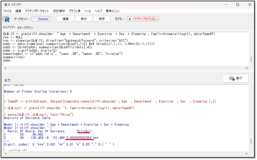 Pr(>Chi)  と記載されている部分がp値です。P<0.05であれば有用なモデルと解釈します。今回は、0.000000000000002364なので、有用なモデルであることが分かります。