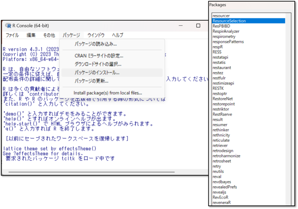 その後で、「パッケージ」→「パッケージのインストール」を選択した上で、「ResourceSelection(リソースセレクション)」というものを探して選択し、OKを押します。これでパッケージのインストールは完了です。