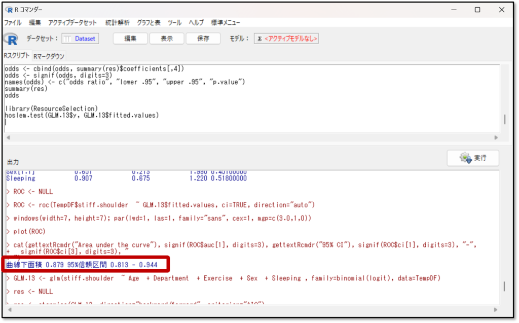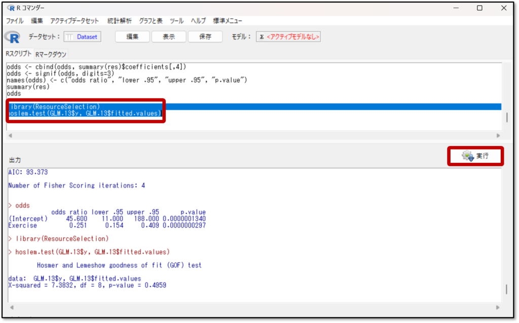実行を押すと出力画面に、前述のHosmer-Lemeshow(ホスマーレメショウ)検定の結果が表示されます。