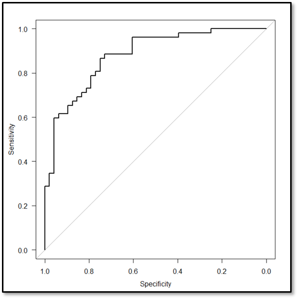 今回は曲線下面積が0.879で95%信頼区間の下限も0.813なので、高い予測精度であると判断します。