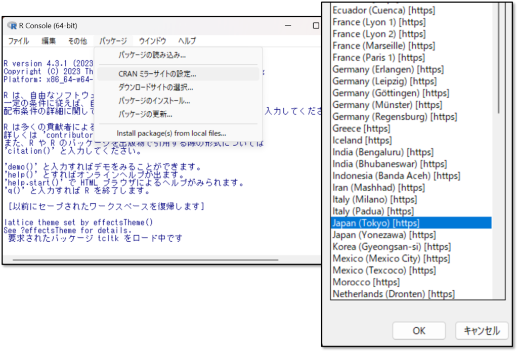 まずは「パッケージ」→「CRAN ミラーサイトの設定」を選択し「JAPAN」を選択しOKを押します。