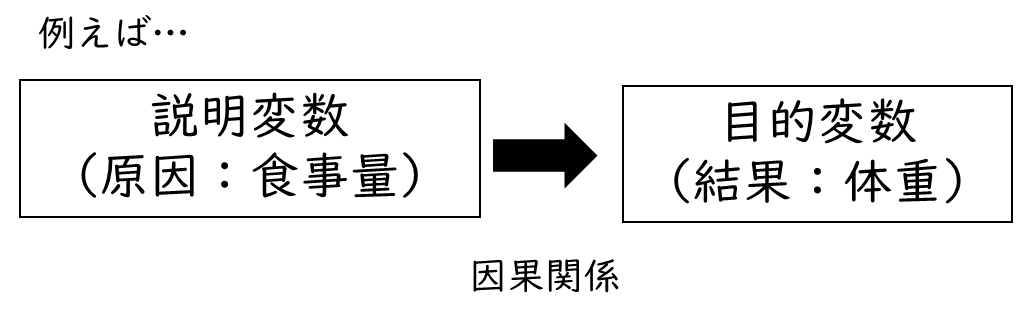 例えば、下記のように食事量が原因で体重が変化するかどうかを検討したい場合は、説明変数が食事量で、目的変数が体重になります。このように、研究では説明変数が本当に目的変数を説明しているかを検討します。