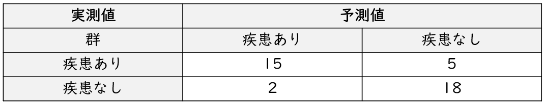 判別的中率は、正しく正解できた割り合いです。そのため、下記の例だと、全体40人のうち正しく予測(つまり疾患ありを疾患あり、疾患なしを疾患なし)できているのが33人なので、33÷40×100で82.5%となります。つまり、予測精度が高いと判断できます