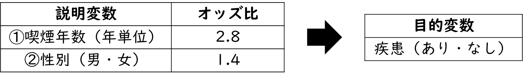 例えば下記の図のように、説明変数①が「喫煙年数(年単位:量的変数)」、説明変数②が「性別(男・女:質的変数)」、目的変数が「疾患の有無」の場合で考えます。その際に説明変数①の「喫煙年数」のオッズ比が2.8、説明変数②の「性別」のオッズ比が1.4という結果が算出されたと仮定します。
