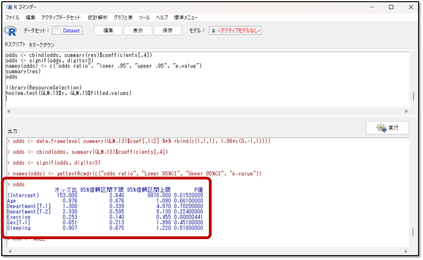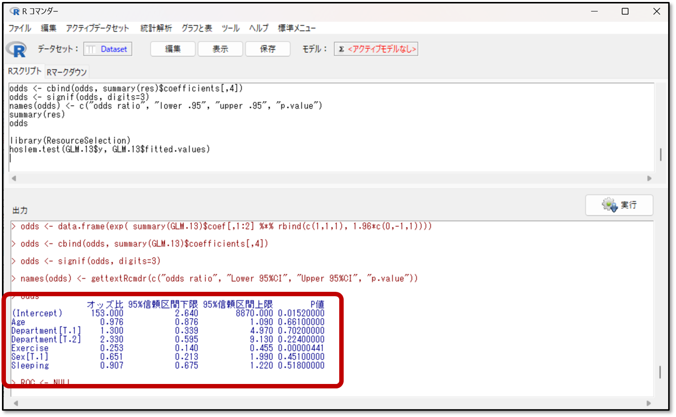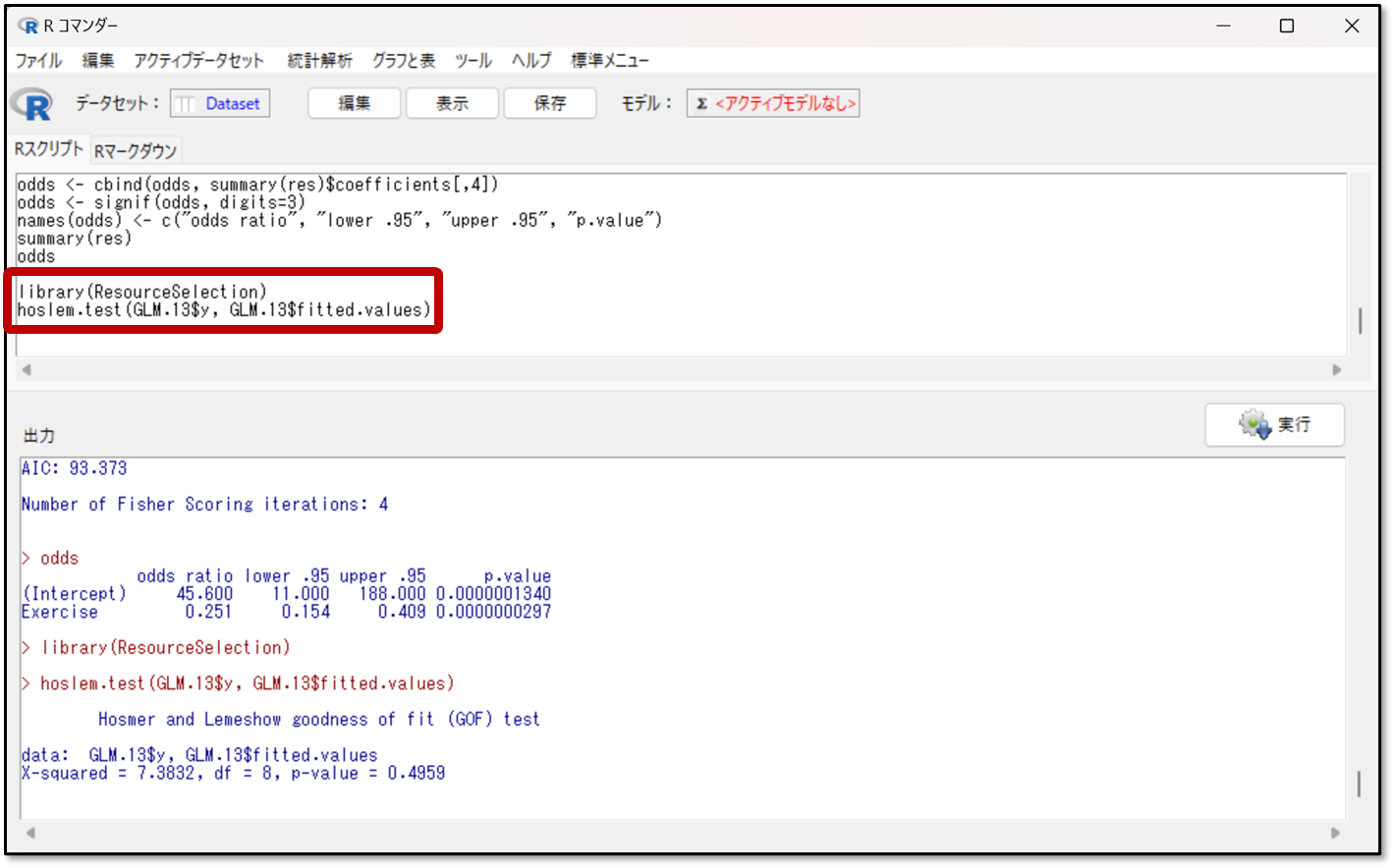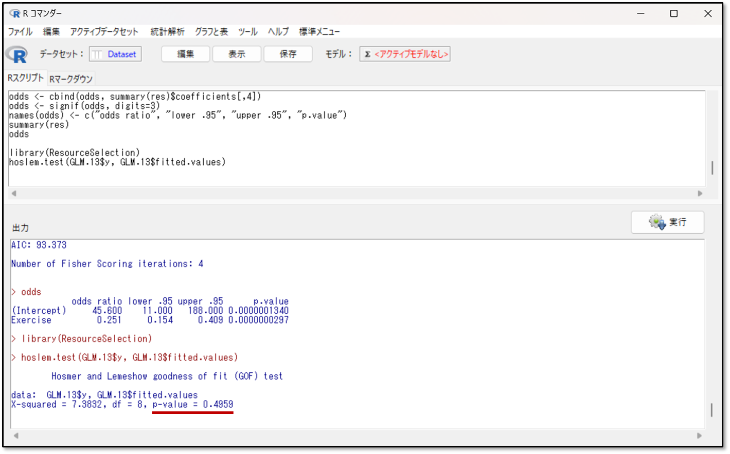 実行を押すと出力画面に、前述のHosmer-Lemeshow(ホスマーレメショウ)検定の結果が表示されます。