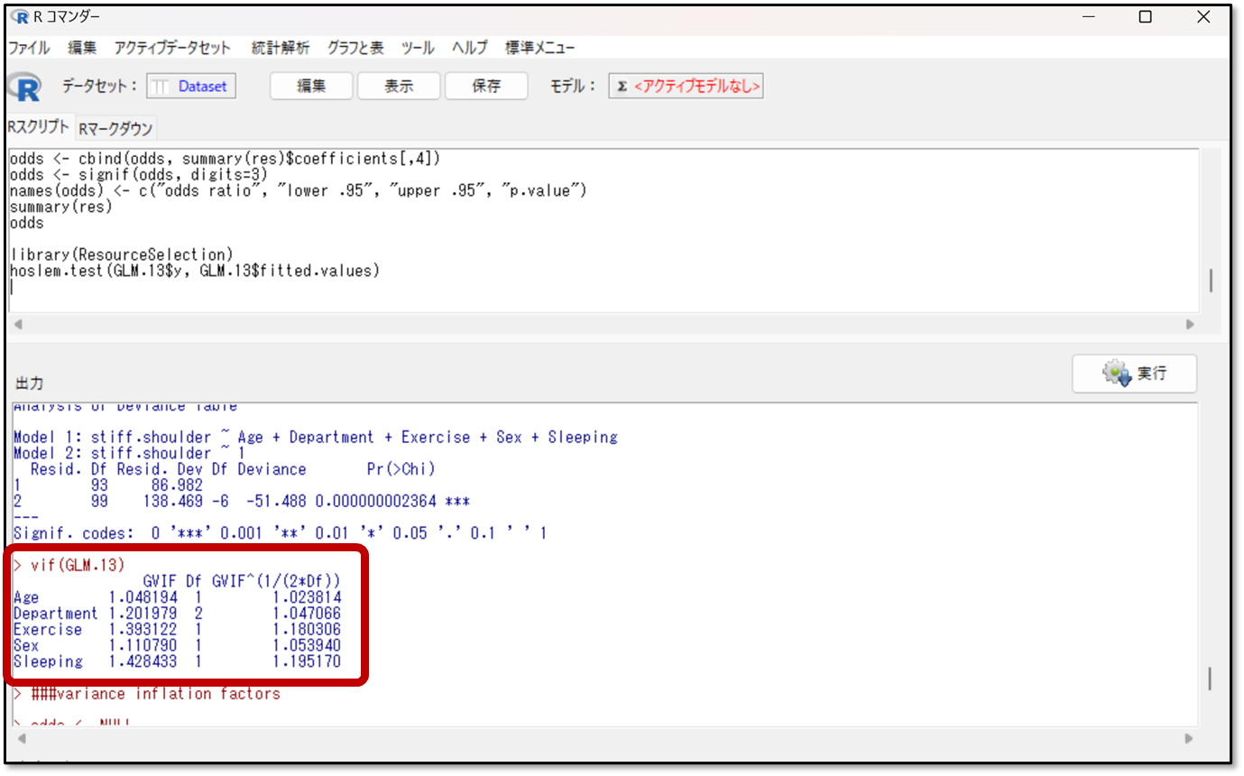 上記のvifと書かれたところを確認します。今回は、全ての変数が1から1.5の値なので、多重共線性の可能性は低いと判断します。